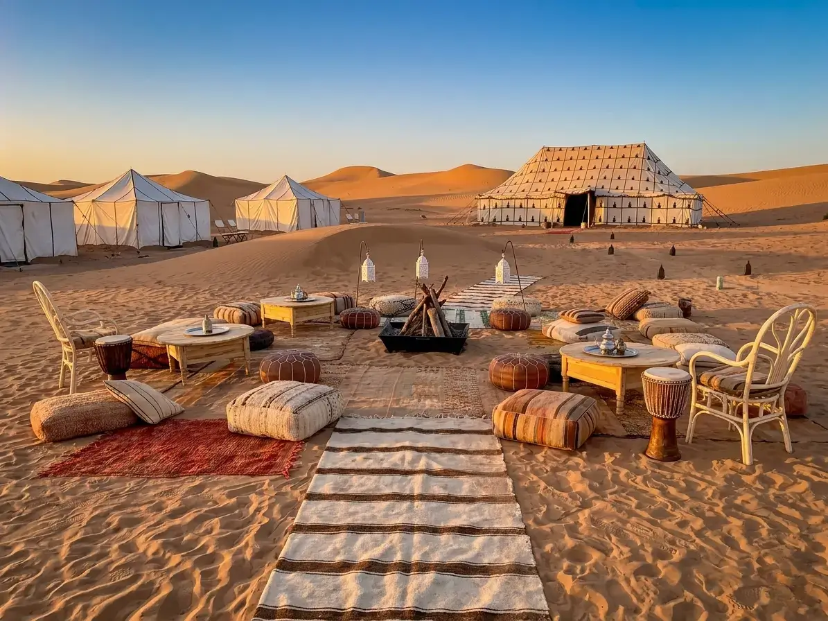 Most camps offer comfortable tents with beds, private bathrooms (in luxury camps), traditional Moroccan dinners, and a campfire evening with Berber music.